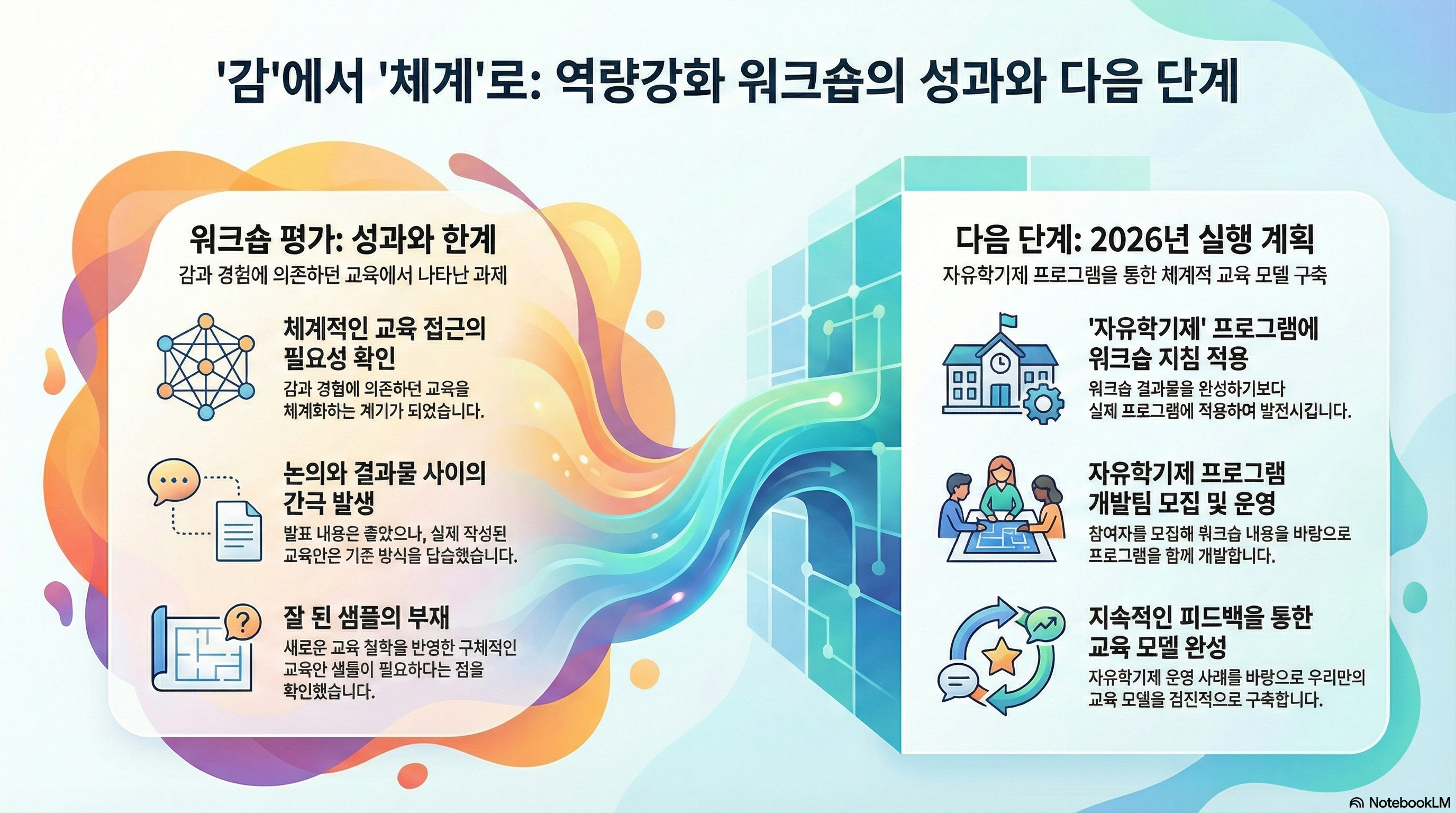 - 기록의 자산화 및 디지털 도구 활용: 흩어진 강의 노하우와 철학적 멘트들을 ‘표준 교육안’으로 문서화하겠습니다. 특히 NotebookLM과 같은 디지털 도구를 적극 활용하여 우리의 기록을 누구나 쉽게 찾아보고 활용할 수 있는 공동의 자산으로 만들겠습니다.