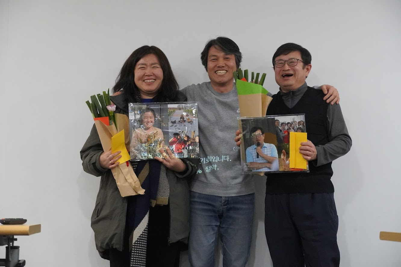 매년 올해의 회원을 선정하여 눈에 띄거나 특별한 기여가 있는 회원들에게 상을 주고 있습니다. 사전 이벤트로 소식지퀴즈에 만점을 받은 김정임, 김동수, 오송원, 전명자 회원에게 상품을 증정했습니다. 올해의 회원에는 김지영, 이경미, 오송원, 노동근, 임희영, 박은희 회원이 수상하셨습니다. 이어서 임원분들과 지도교수요원 등 인사를 하고 수고해주시는 분들에게 선물도 나누었습니다. 이어서 임원분들과 지도교수요원 등 인사를 하고 수고해주시는 분들에게 선물도 나누었습니다. 마지막으로 사무처 인사를 하면서 올 한해 휴직하는 전강희 팀장에게 잘 쉬다 꼭 복귀하라는 메세지도 남겼습니다.